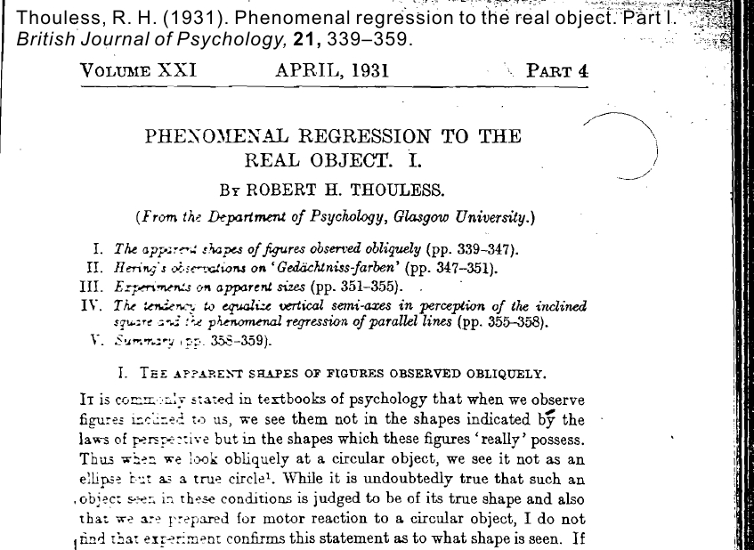 Thouless, R. H. (1931). Phenomenal regression to the real object. Part I. British Journal of Psychology, 21, 339–359.