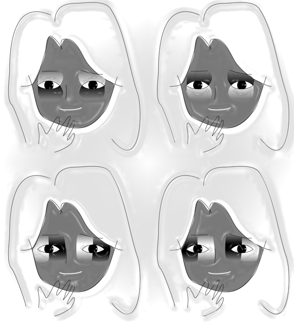 左上の顔は上向きの視線に、右上は下向き、左下は向かって左向きの視線に、右下は向かって右向きの視線に相対的に変位して見える。すなわち、視線方向は暗いアイシャドーとは反対方向に、明るいアイシャドーとは同方向に変位して見える。