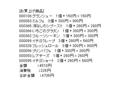 The rows of letters are horizontally aligned but the right side of each appears to tilt counterclockwise. This image was discovered on a PC display in a receipt of the purchase of a variety of cakes. It looks delicious.