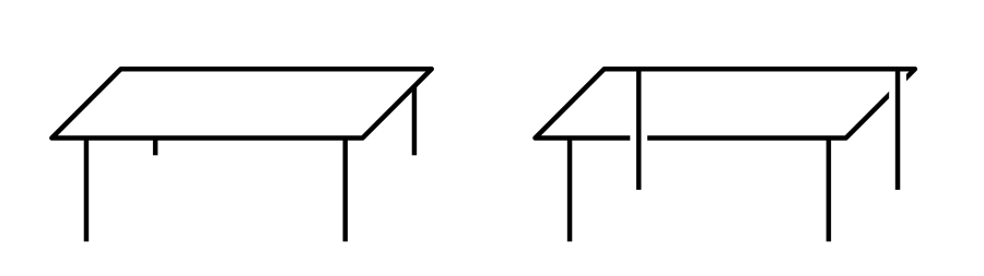 左右の赤い平行四辺形は同じ形であるが、左の平行四辺形は左辺と右辺は上方に開いて見え、右の平行四辺形は左辺と右辺は下方に開いて見える。