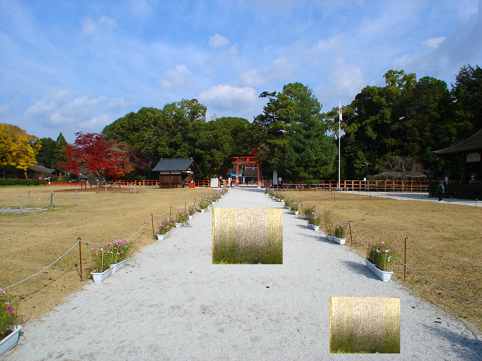 3つの干草ロールは同じ大きさであるが、左から大・中・小に見える。