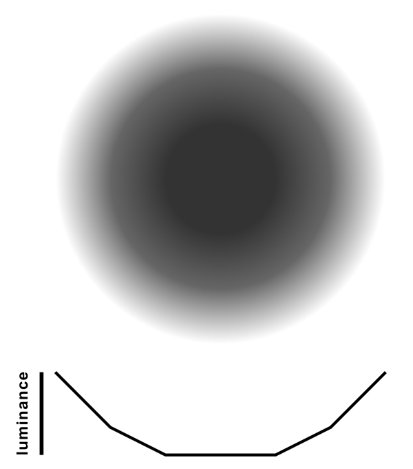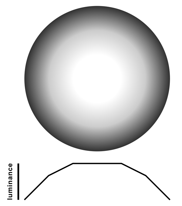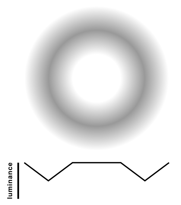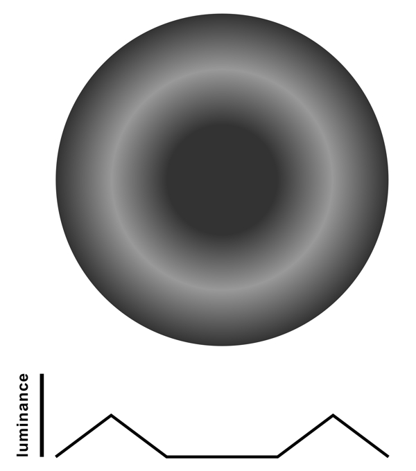 マッハの帯のせいで、円盤が凹凸に見える(飛中漸氏より寄せられたアイデアを作品化)。凸に見えるのは輝度勾配部分で、凹に見えるのは輝度一様部分である。そのほか、外周が収縮して見え、下のグラフも上に動いているように見える。