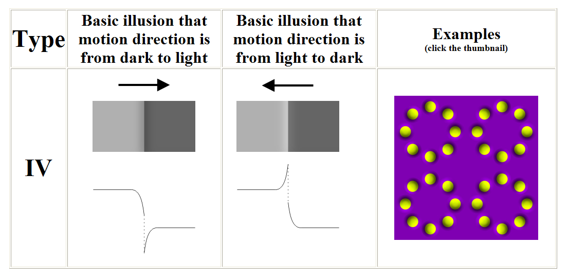 これらは、 黒→濃い灰色→白→薄い灰色→黒 の方向に動いて見える錯視群である。