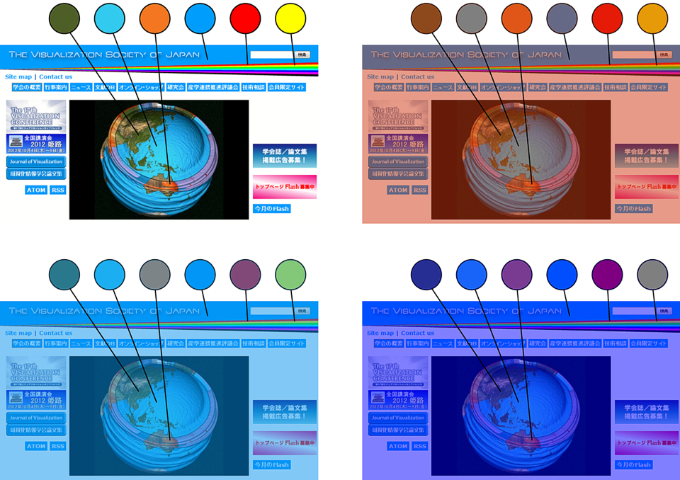 左上は元の画像(2011年10月30日コピー)。右上は「地球の水色」がない場合に灰色で代用した図。左下は「オーストラリアのオレンジ色」がない場合に灰色で代用した図。右下は黄色がない場合に灰色で代用した図。