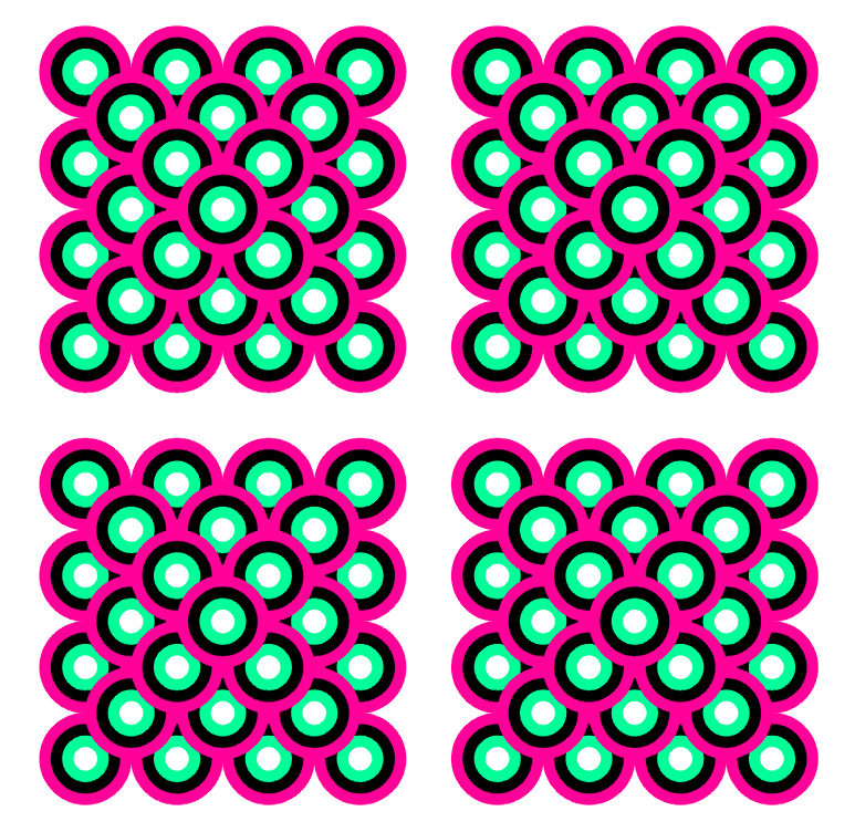 注意:気持ち悪くなる前にページを切り替えて下さい。コピーして他の人に見せないで下さい。このページに直接リンクを張らないで下さい。これらの図形を長時間眺めると危険であるといった証拠はありませんが、少なくともベクション(平衡感覚の自己誘導知覚)を引き起こしますので、ご注意下さい。