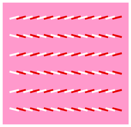 Rows are parallel but appear to tilt clockwise (top, center, bottom) or counterclockwise (the rest two), which is the Zöllner illusion. Moreover, anomalous motion illusion is observed, too.