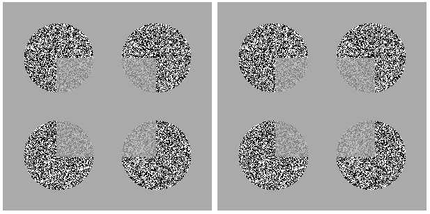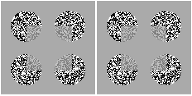The illusory contours of photopic phantoms are more distinct when they have crossed disparity. For cross fuser, fuse the left and middle panel; for uncross fuser, fuse the middle and right panel.