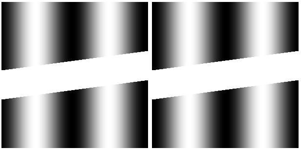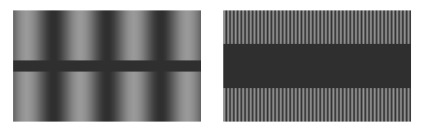 For visual phantoms, the less the spatial frequency of the inducing grating or the shorter the width of the occluder, the more visible the phantoms (the left image). On the other hand, the more the spatial frequency of the inducing grating or the longer the width of the occluder, the less visible the phantoms (the left image). This characteristic resembles that of Petter's effect.