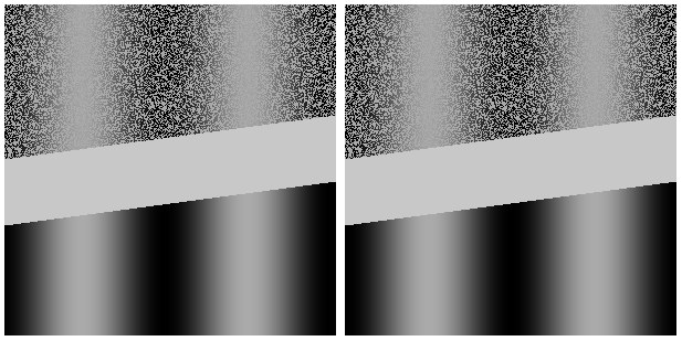 Fusing the two figures, you see a transparent square in front of the background. This means that regions of lower contrast tend to form phantoms.