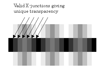 Stationary phantoms are explained in terms of perceptual transparency, in which the surrounding grating induces counterphase lightness induction in the occluder (McCourt, 1994) and generates unique transparency that gives the continuation and the fixed depth of phantoms. The figures show the appearance of stationary phantoms (the upper image) and the explanation in terms of perceptual transparency (the lower image).