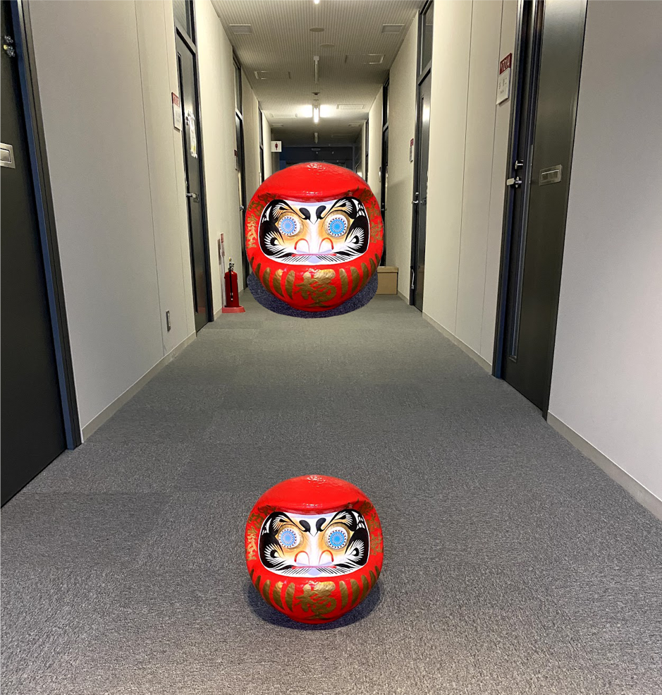 手前のダルマをコピペして奥に置くと、大きく見える。