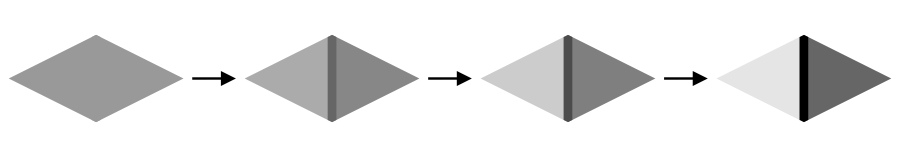 This illusion does not depend on the luminance gradient of inducers. Although the luminance gradients are the same (white to gray) between the two figures shown below, the direction of illusory motion is opposite to each other. The upper two rows in the left figure appear to move leftward while those in the right figure appear to slide rightward; the lower two rows in the left figure appear to move rightward while those in the right figure appear to slide leftward.