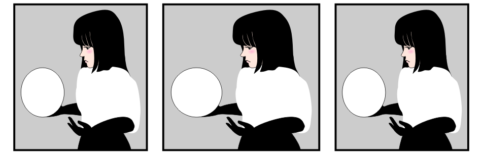 目の一対と口の一つを他の部分とは異なる奥行きに示すと、ガクガク感は減少するとともに、異なる奥行きに示した目と口が動いて見える。ただし、顔全体よりも奥の面に見えるように示した場合は、顔全体の面にある目と口が動いて見えることもあるようだ。