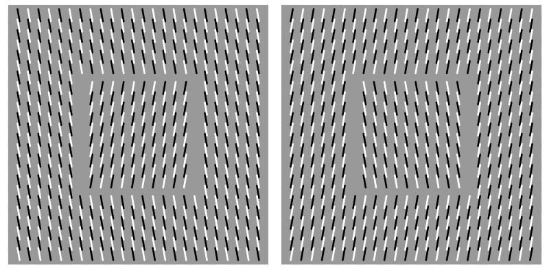 動く錯視・・・左の青い長方形内では上半分のもみは左に、下半分は右に動いて見える。右の青い長方形内ではその反対。