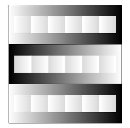 一番右に置かれた正方形が白く見えるが、すべて同じ輝度グラデーションの正方形である。