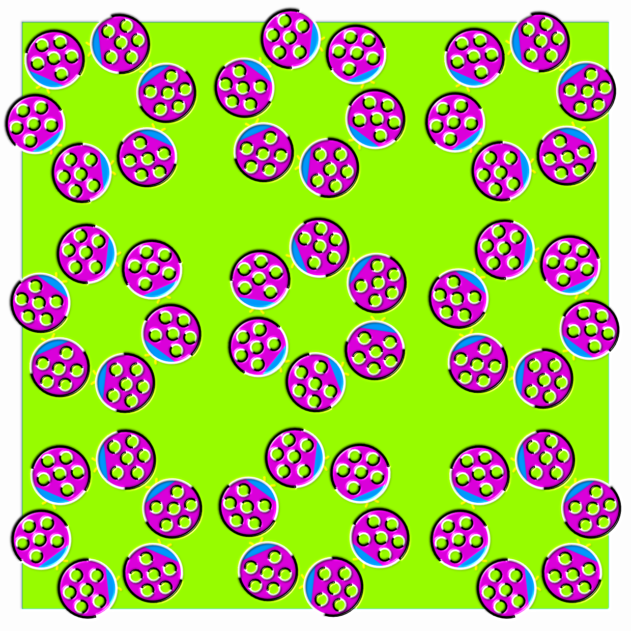 左の太鼓のリングは反時計回りに、右のリングは時計回りに回転して見えるが、周囲のつぶつぶも引きずられて動いているように見える。