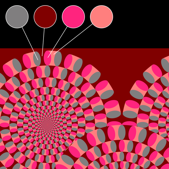 明るいディスプレーでは各リングは時計回りに、印刷物を暗いところで見ると反時計回りに回転して見える。
