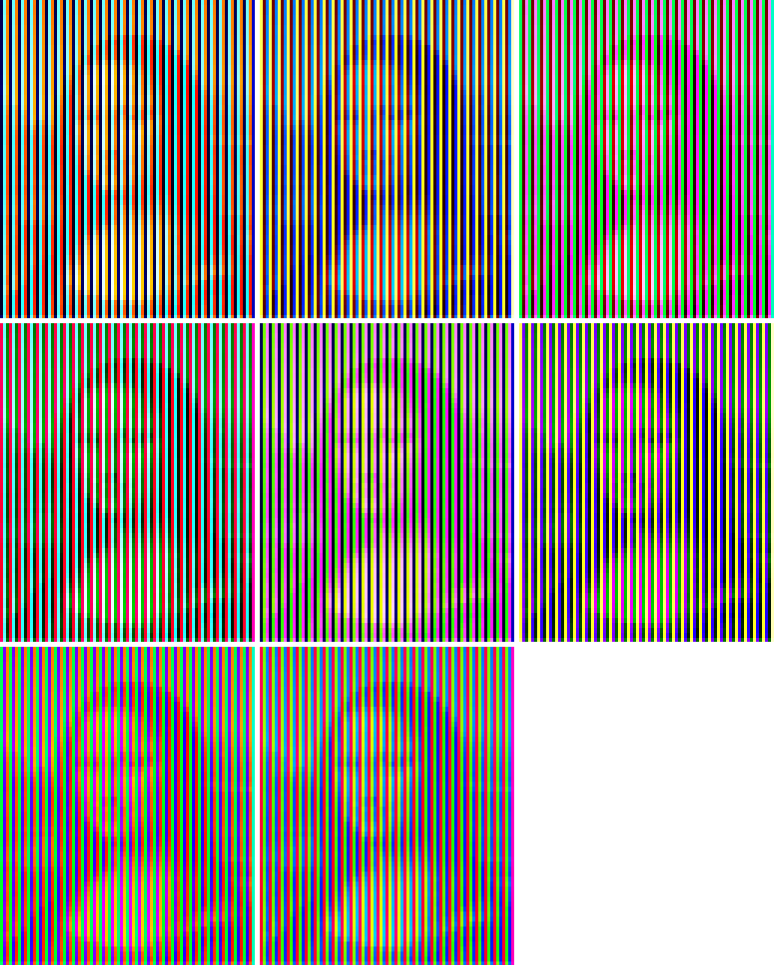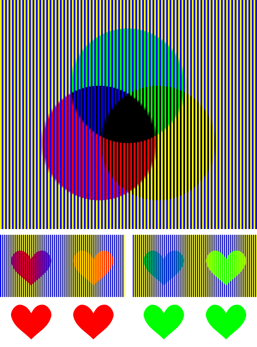 左の髪と服は赤く見え、右のそれらは緑色に見えるが、どちらも青・黄・黒の縞模様でできている。画像をクリックすると4 x 4倍の高解像度ファイルが出るので、確認できるかもしれない。