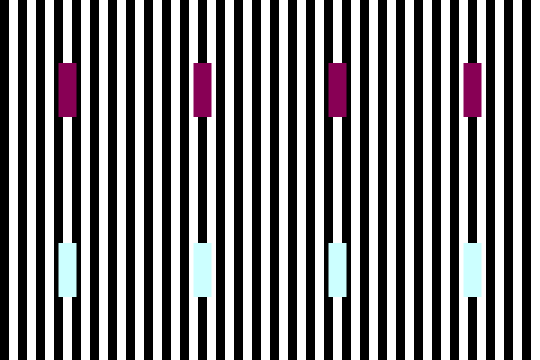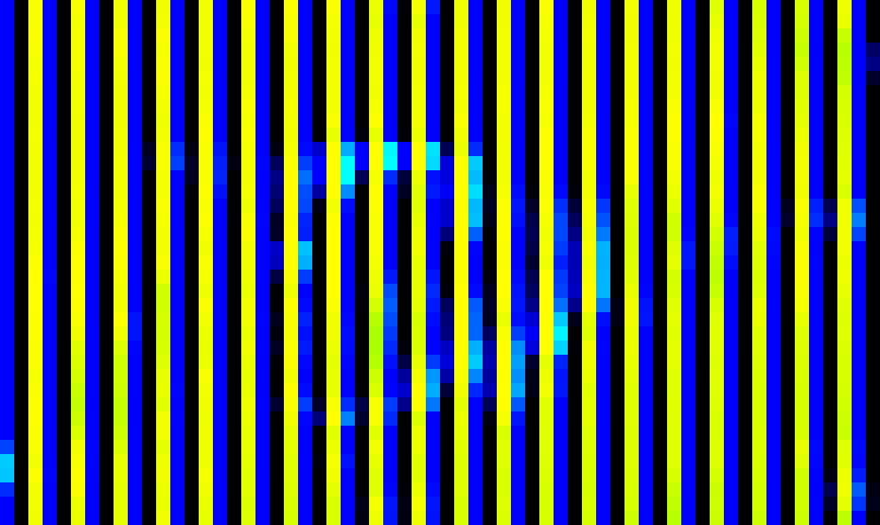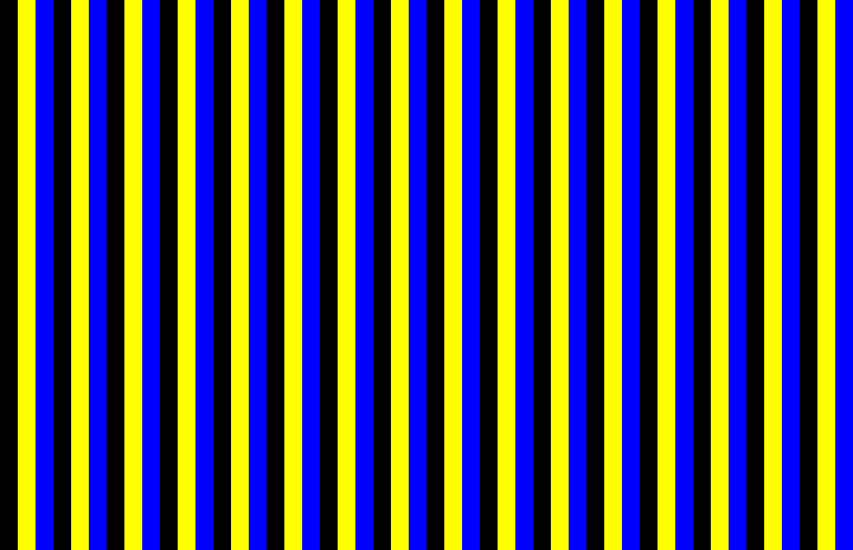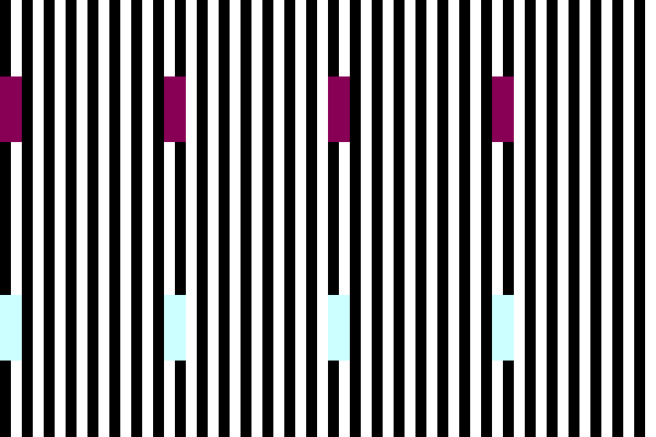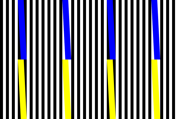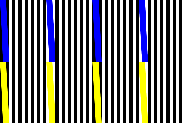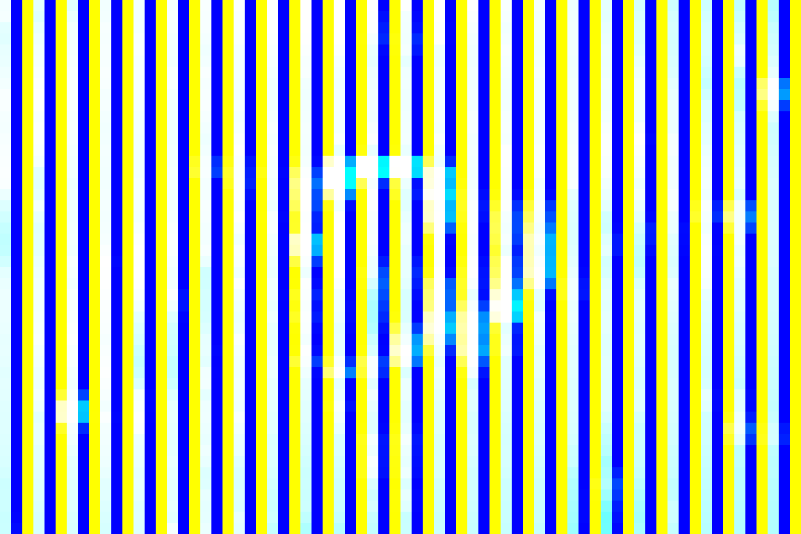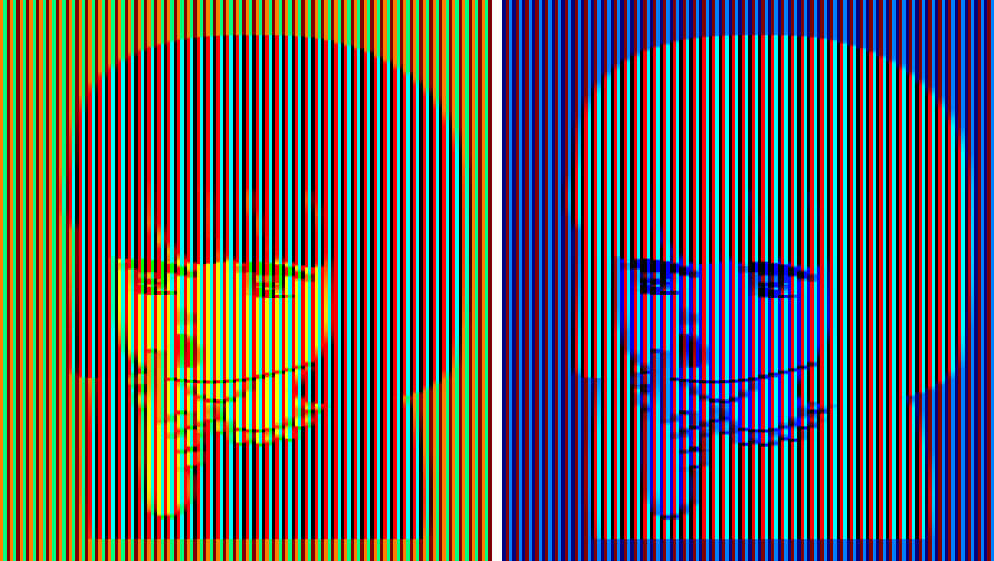 左の髪と服は青く見え、右のそれらは黄色に見えるが、どちらも青・シアン・黒の縞模様でできている。