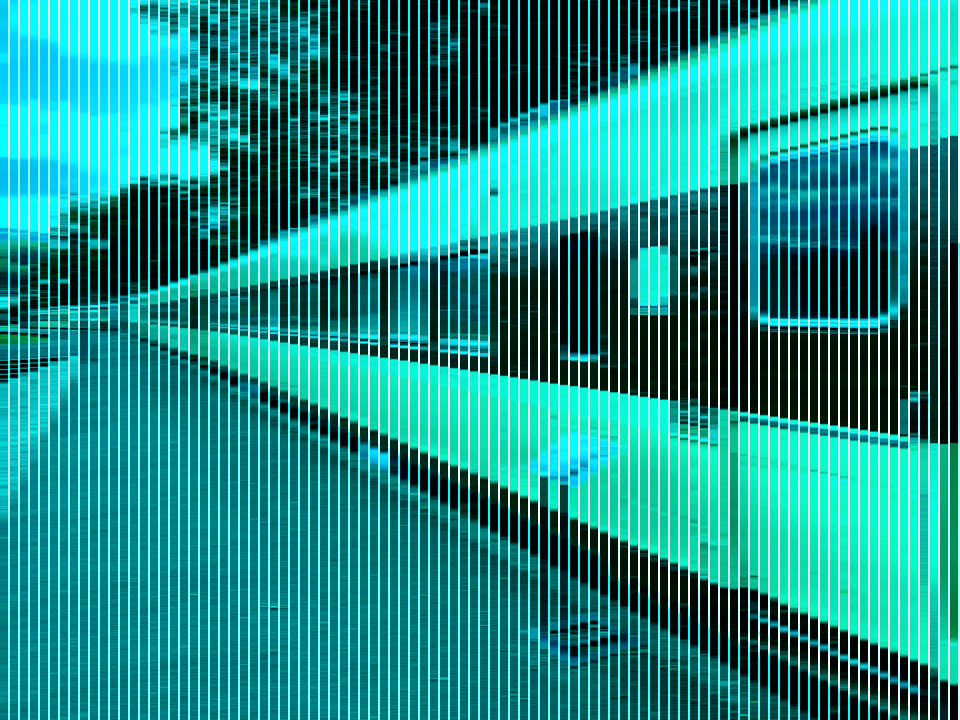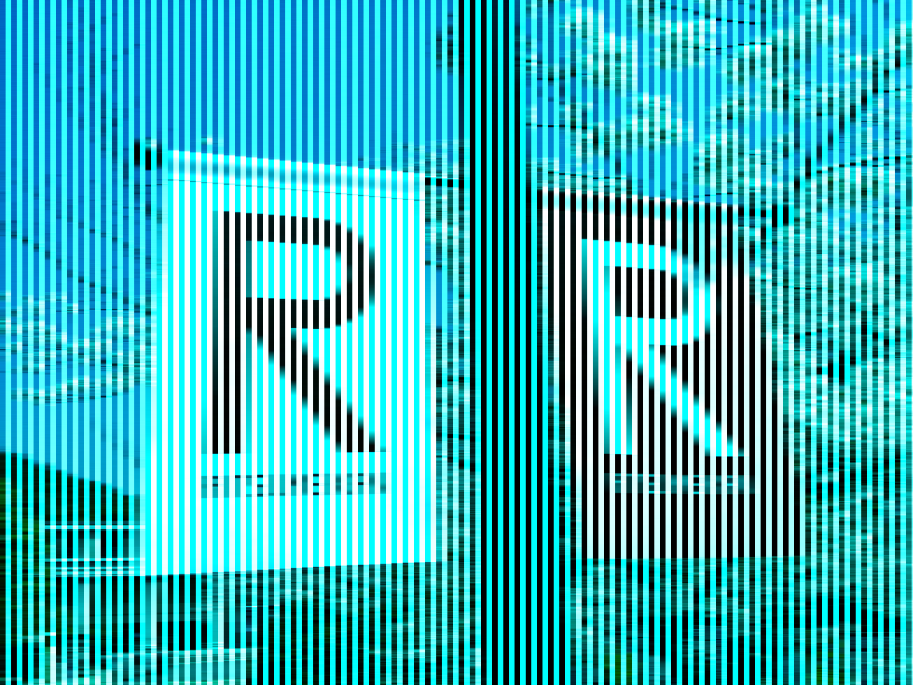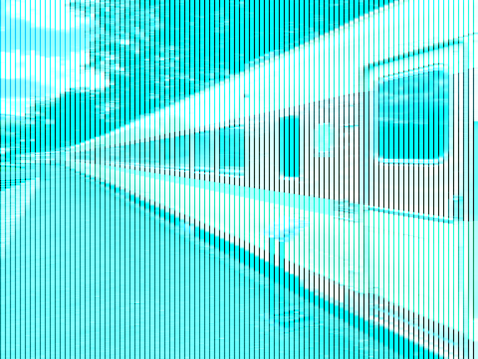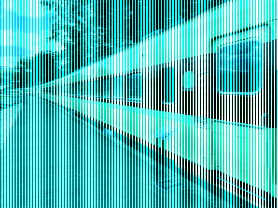 左の髪と服は青く見え、右のそれらは黄色に見えるが、どちらも青・シアン・黒の縞模様でできている。