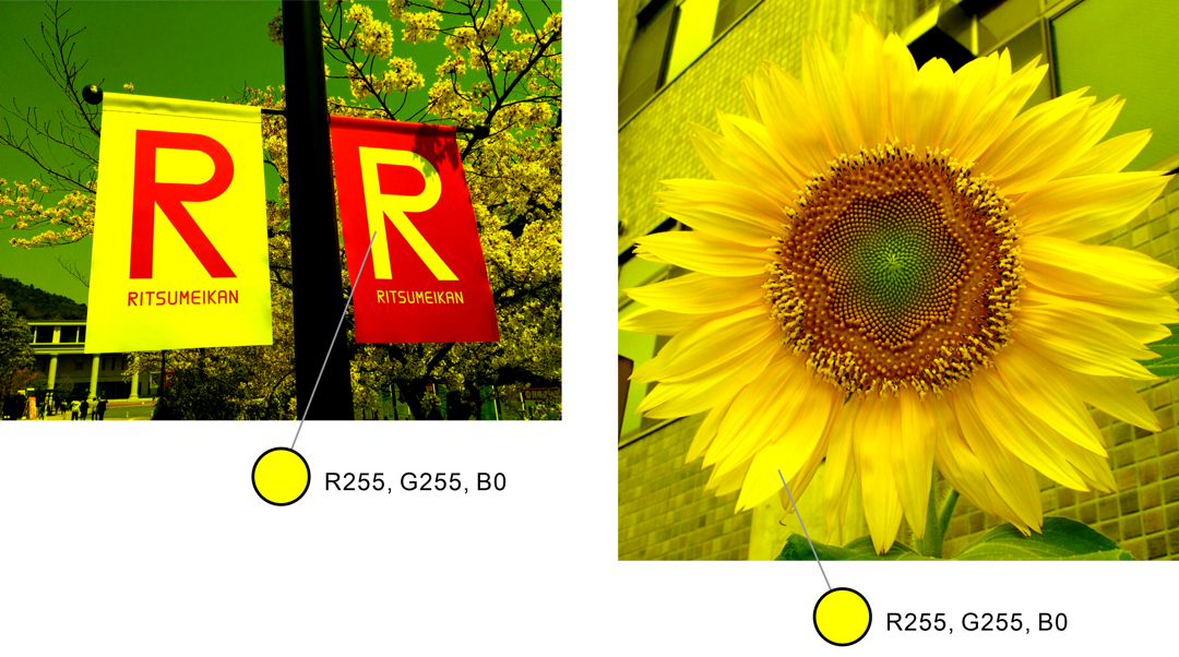 左の旗のRは白く見え、右のひまわりの花びらは黄色く見えるが、どちらも黄色である。