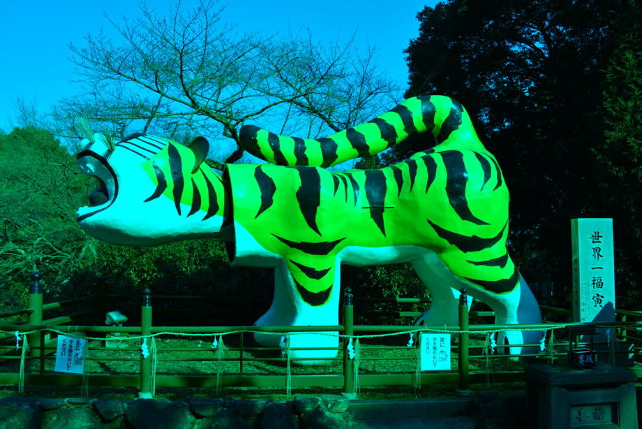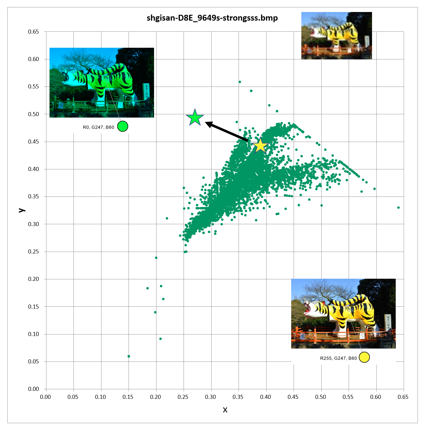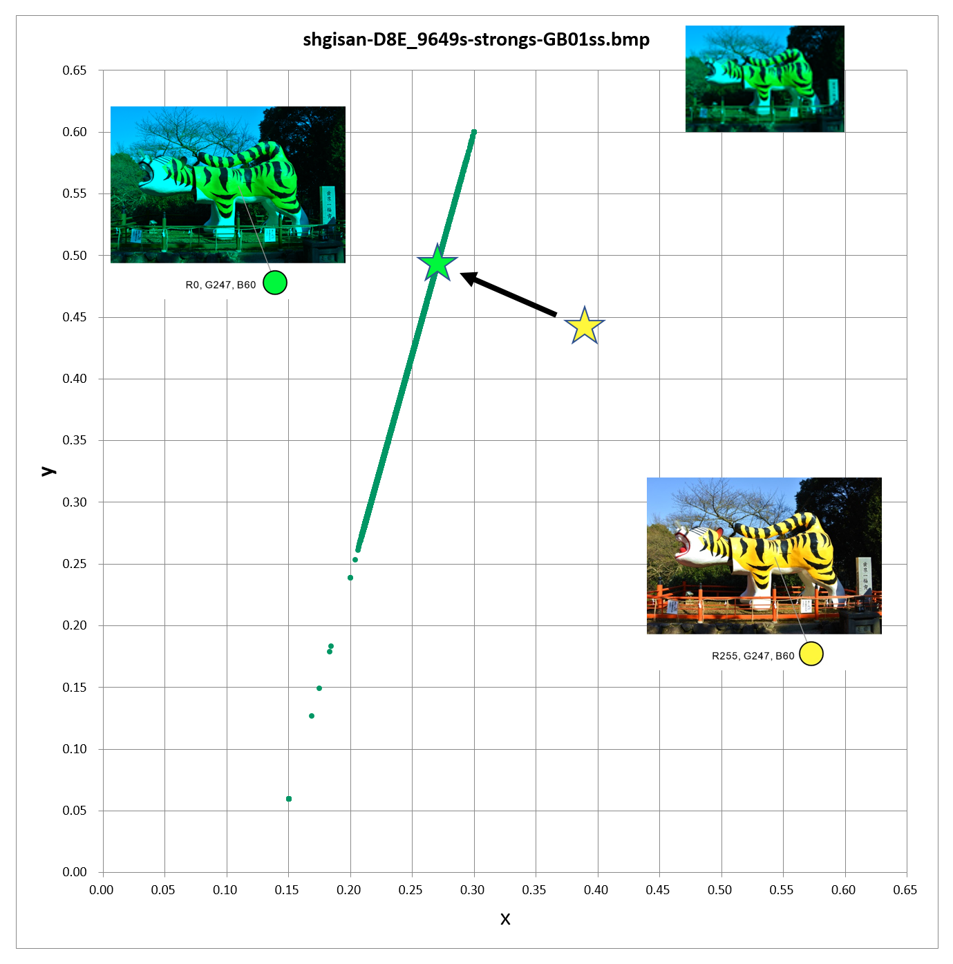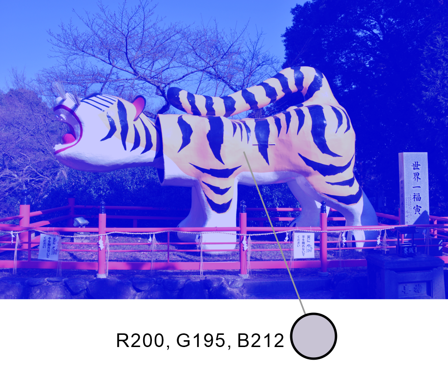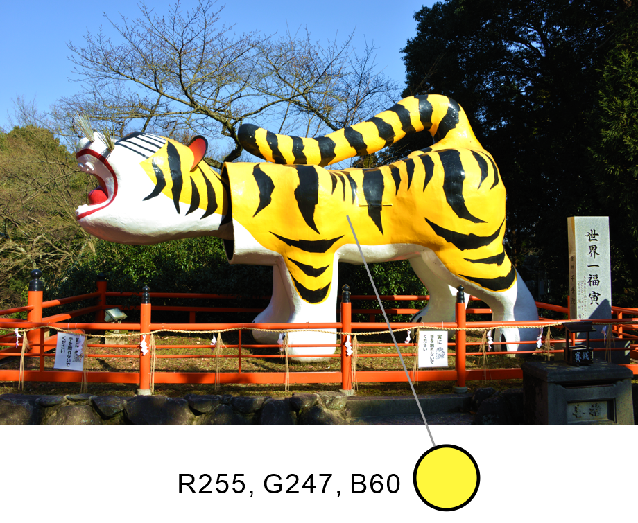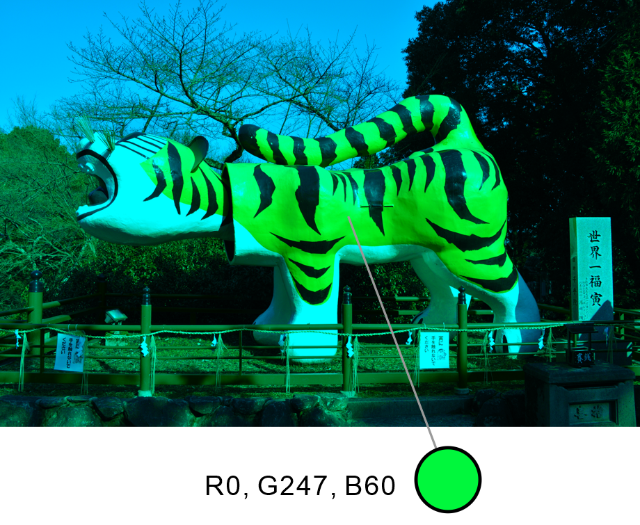 世界一福寅は黄色く見えるが、この画像のすべての画素のR値はゼロなので、画素の色としては緑である。