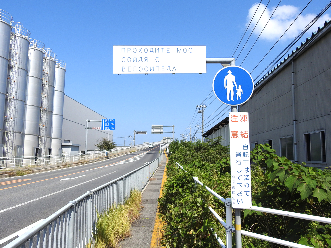 "Please step down from the bicycle and walk" in Russian and Japanese