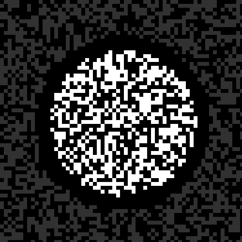 輝度コントラストの高い部分が、低い部分よりも手前に見える現象。この図では、白い四角形でてきた円形領域は背景が黒のためコントラストが高く、周辺の暗い灰色は背景の黒とのコントラストが低い。このため、中央の円形領域が手前に見える。