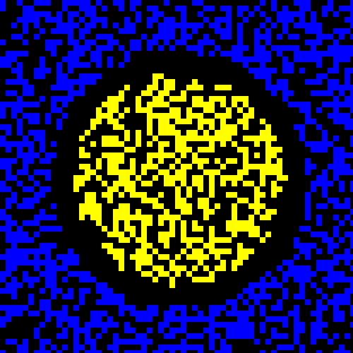 格子がディスクの手前に見える人が多分多い。格子の交点の白い雲状の部分に黒い点が見えるのは、きらめき格子錯視(scintillating grid illusion)あるいはバーゲン錯視(Bergen illusion)である。ついでに言うと、まばたきを続けるときらめき格子錯視が見えない! 白い線が黄色く見えることもある(遠隔色対比?)。