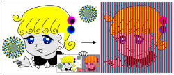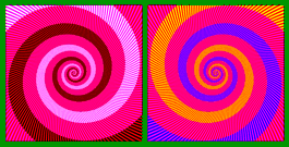 この動画は、2枚の静止画から成っている。1枚目(下図「風林火山」)は6秒間提示され、2枚目(下図「武田信玄」)は1秒だけ提示される。どちらの画像も、左側は白と黒の渦巻きで、右側は黄と青の渦巻きである。どこか同じ場所を見つめながら眺めていると、6秒間提示される1枚目は「正しく」見えるが、1秒間だけ提示される2枚目は、左側は黄と青の渦巻きで、右側は白と黒の渦巻きに見える。この錯視は、「錯視残効」 というものに違いない(そんなカテゴリーは今までなかったと思うが)。
