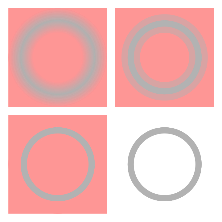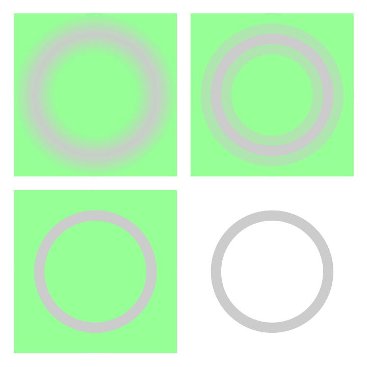 黄色のサーチライトが当たっているように見える。各縦列の円の中の色グラデーションは同じであるが、上2つは黄色の円に見え、下2つは青の円に見える。