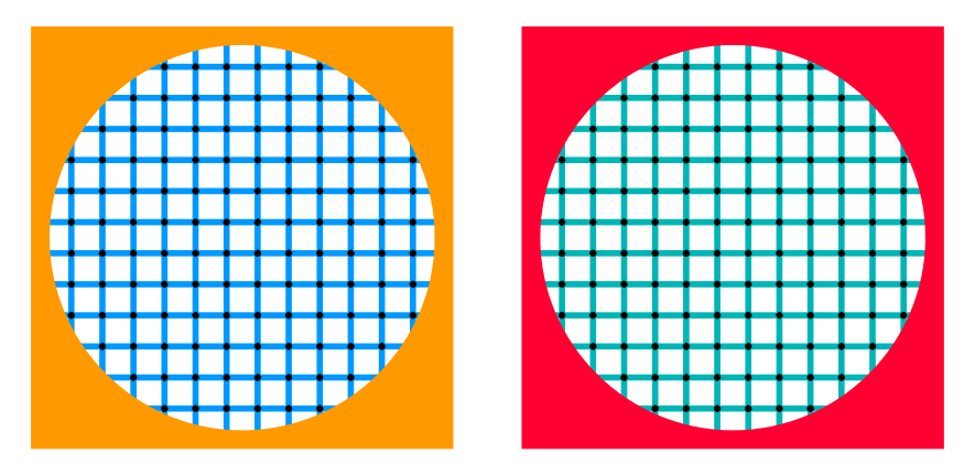 青あるいは緑の格子に描いた黒点がオレンジ色あるいは赤に光って見える。黄色説もあり。