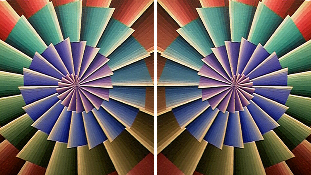 上の扇形には黄色や赤色が見え、下の扇形には彩度の低い青が見える。左の扇形に緑とかが見えれば(私は見えないが)ベンハムのコマと同じ?