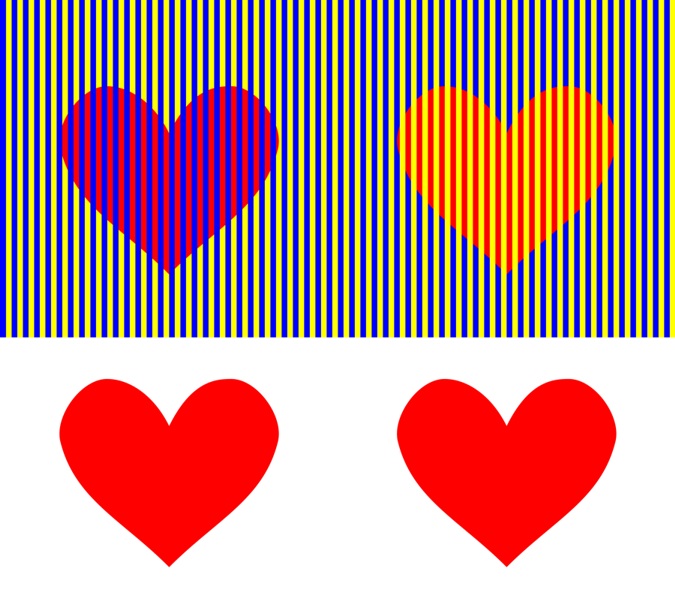 ムンカー錯視の例。左上のハートは赤紫がかって見え、右上のハートはオレンジ色がかって見えるが、下のハートと同じ色である。