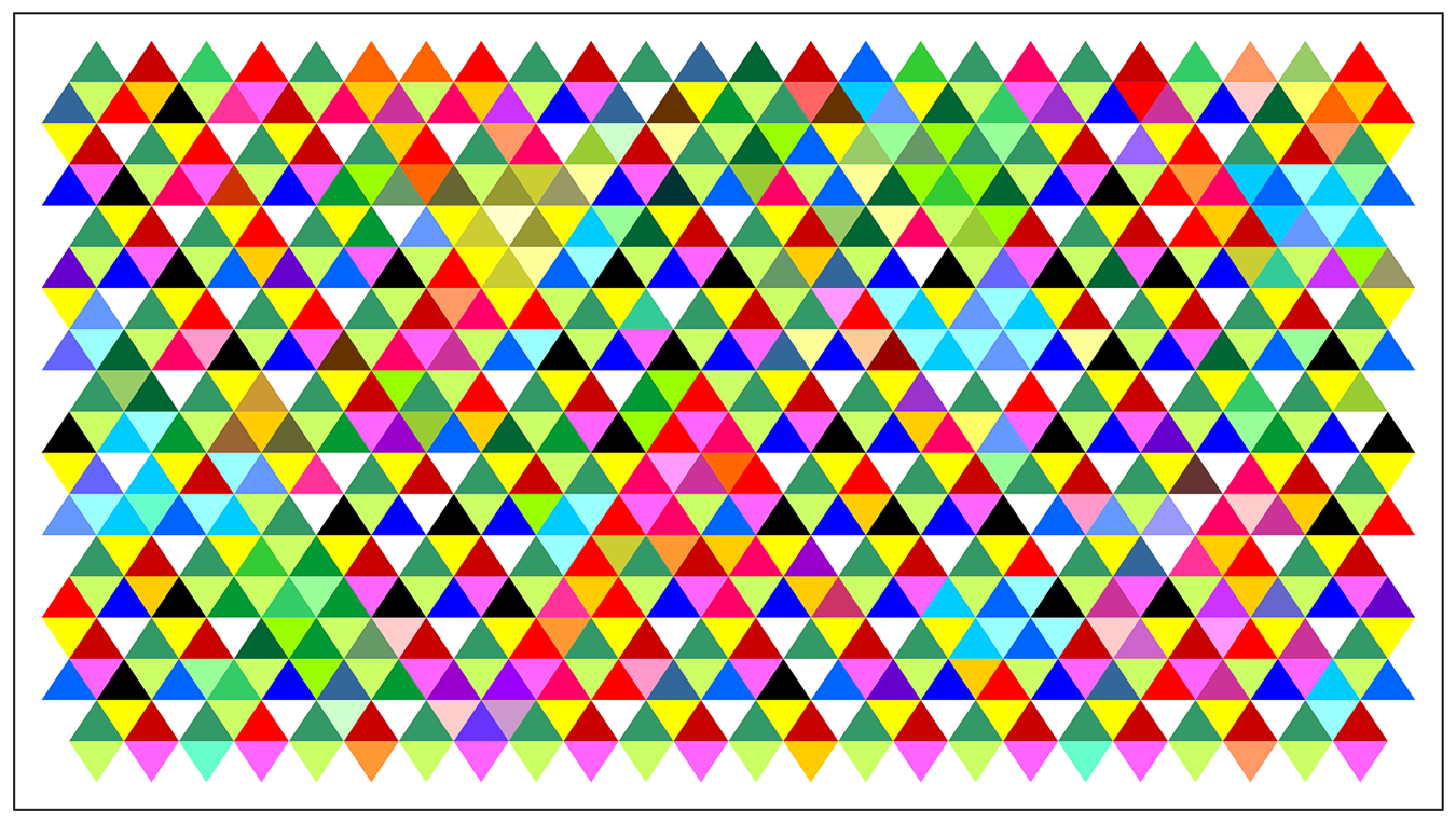 いろいろな大きさの緑がかった△(三角形)が見える。いろいろな大きさの白い▽(逆三角形)が見えることもある。右下に向いた底なし牛乳パックのような直方体を並べた図のように見えることもある。また、左下に向いた底なし牛乳パックのような直方体を並べた図のように見えることもある。