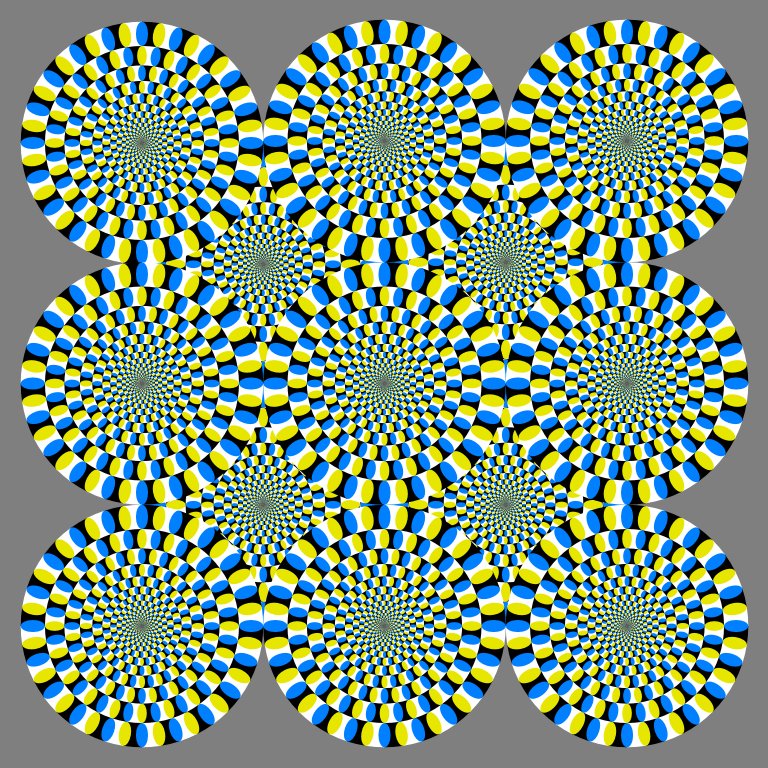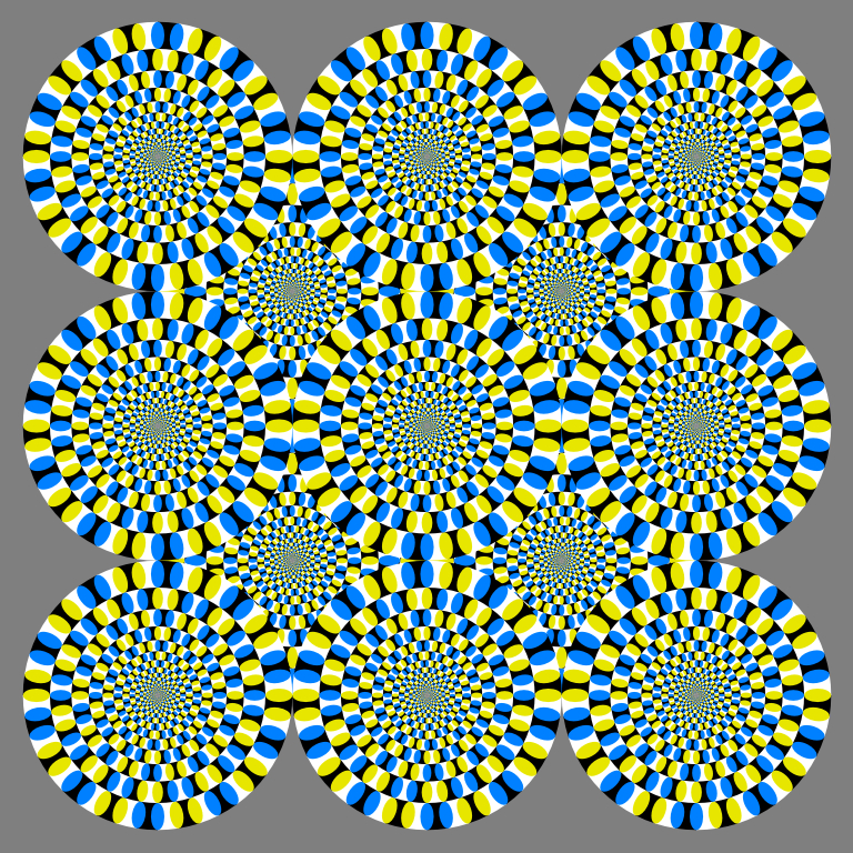 Concentric rings appear to be spirals. Moreover, each set of rings appears to rotate.