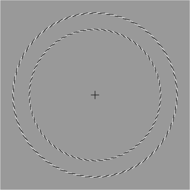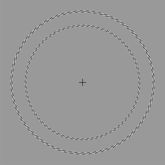 この動画では「目」が時計回りに2秒間回転、2秒間静止を繰り返している。静止している時、目は時計回りに回転して見える。両目の中間に視線を置いている時は目の内側が回転して見え、さらに周辺視で見ると目は全部回転して見える。
