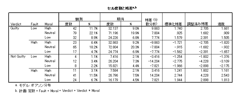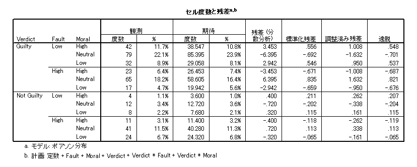 階層的対数線型モデルなので,Fault,Verdict,Moral のそれぞれを明示的に含めても,含めなくても分析結果は変わりません。ただし,Fault,Verdict,Moral のそれぞれの効果を明示的に含ませるかどうかで,パラメータの推定値が異なります。パラメータはオプションで指定すれば出力されます。