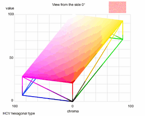 この色空間においてsRGBの占める範囲を知らないとピンとこないと思いますので、参考までに小さく再掲します。この色空間(北岡製hHCV。リニアRGB空間を白黒軸で直立させて、白黒軸を輝度軸に置き換えたもの)におけるsRGBの色立体はこちらです。