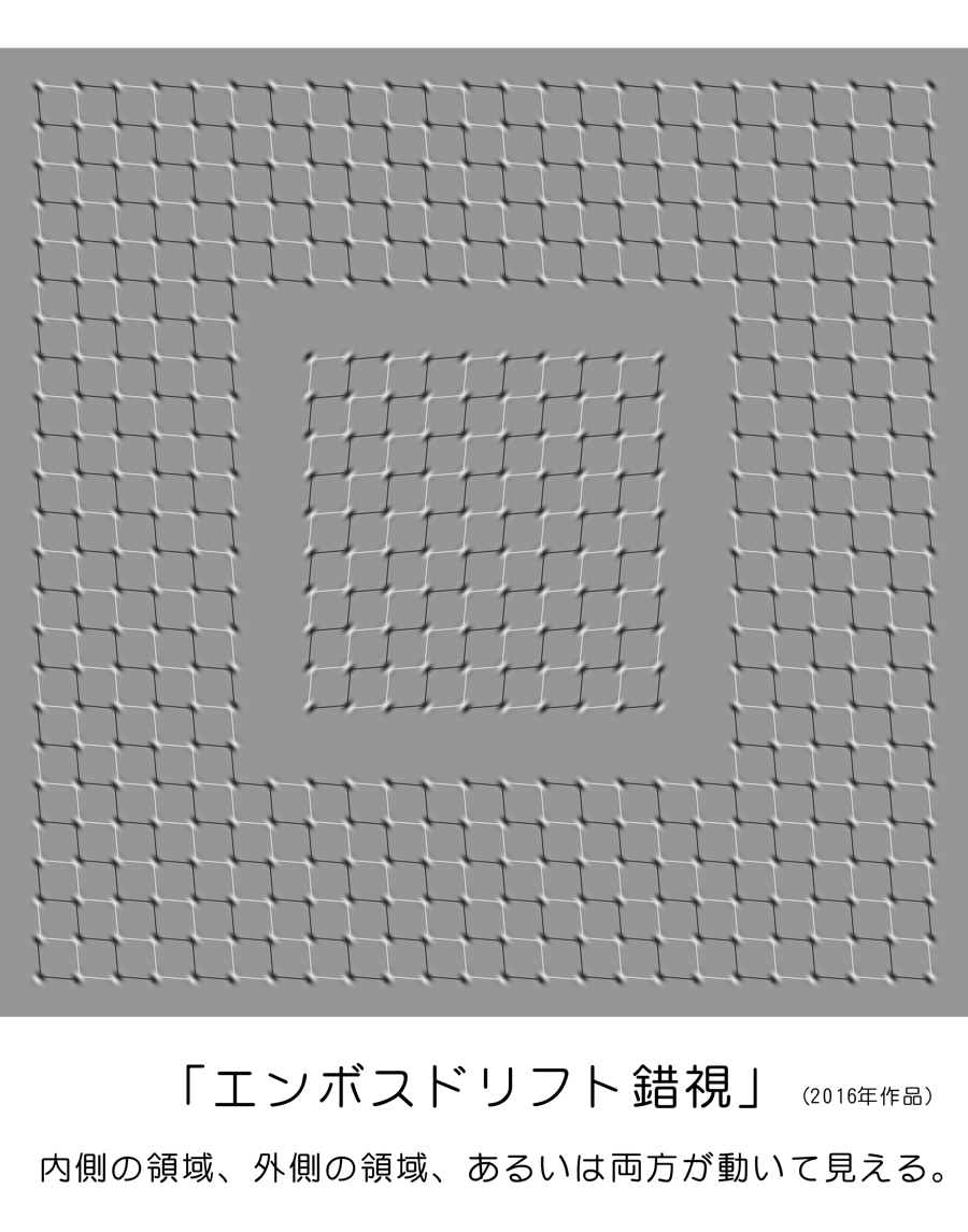 古典的な幾何学的錯視の例。(a)ミュラー=リヤー錯視。上下の水平線分は同じ長さであるが、下の方が長く見える。(b)エビングハウス錯視。リングの中の円は左右同じ大きさであるが、大きい円のリングに囲まれた左の円よりも、小さい円のリングに囲まれた右の円の方が大きく見える。(c)ボンゾ錯視。Λや<の頂点に近い方に置かれた対象が大きく見える。具体的には、2本の水平線分は同じ長さだが、上の方が長く見える。2つの円は同じ大きさだが、左の方が大きく見える。(d)ポッゲンドルフ錯視。2つの斜線は一直線上にあるが、右の斜線の方が上方に変位して見える。(e)ツェルナー錯視。垂直より反時計回りに45度傾いた黒い線は互いに平行だが、交互に傾いて見える。交差する短い線との交差角度の過大視の現象である。(f)へリング錯視(湾曲錯視)。水平線分が曲がって見える。上の線分は上に凸、下の線分は下に凸に見える。(g)ミュンスターベルク錯視。白と黒の正方形の列を図のようにずらして配置し、列の境界に線分を描くと、図ではそれらは水平であるが、交互に傾いて見える。本図のように線が灰色の時は、カフェウォール錯視(Café Wall illusion)と呼ばれることが多い。(h)フレーザー錯視。垂直より反時計回りに45度傾いた仮想線に沿って短い斜線の列が描かれているが、列の傾きは短い斜線の傾きの方向に変位して見える。ツェルナー錯視とは逆の錯視である。(i)フレーザー錯視の渦巻き錯視。フレーザー錯視では、傾いて見えるのは線分であるが、傾いて見える対象を円状に配置した時に観察できる錯視である。具体的には、同心円が渦巻きのように見える。