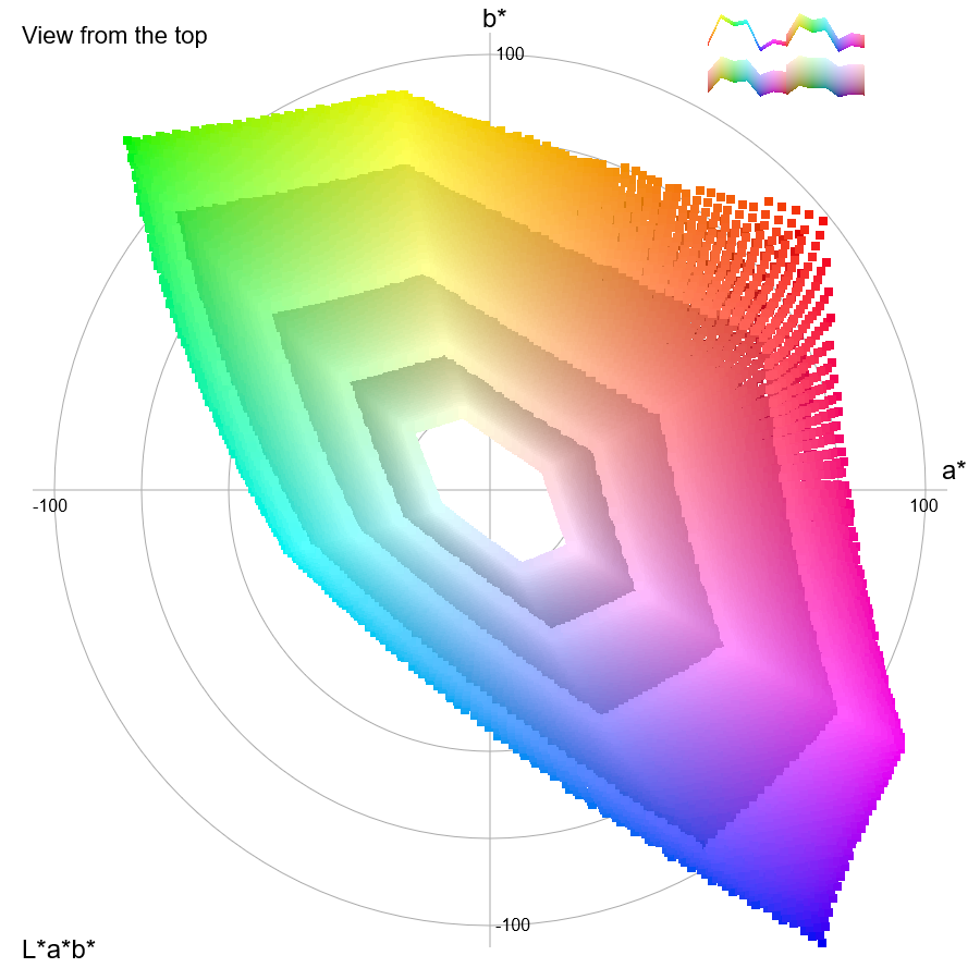 以下、各色空間にプロットした等彩度画像を横から見たところと上から見たところ