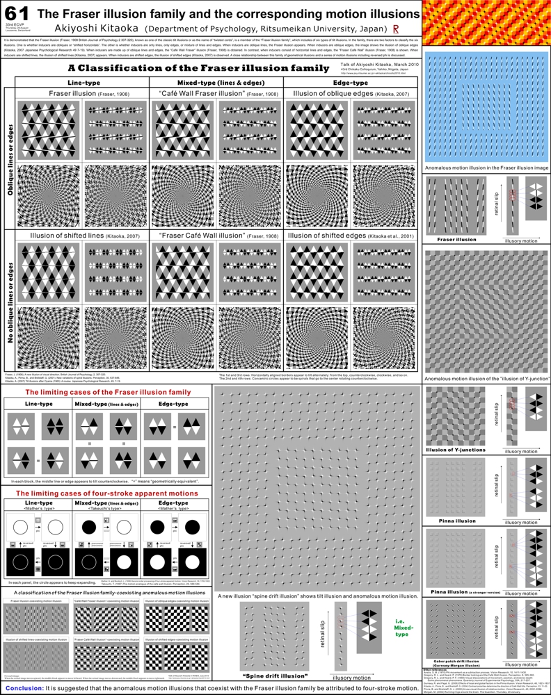 Kitaoka, A. (2010). The Fraser illusion family and the corresponding motion illusions. Perception, 39, Supplement, #61, p. 178.