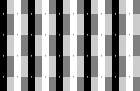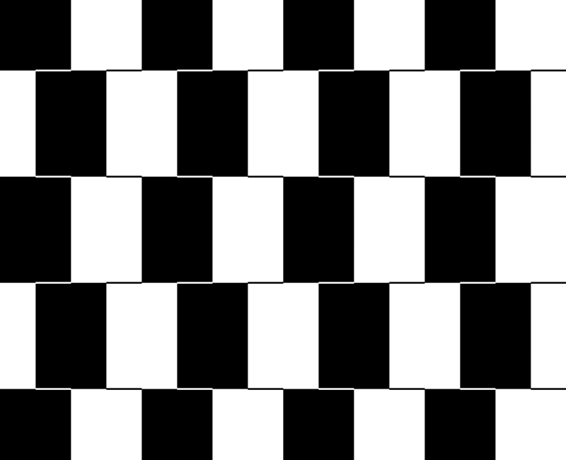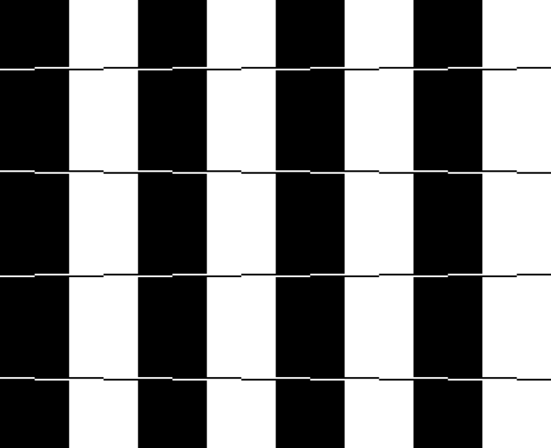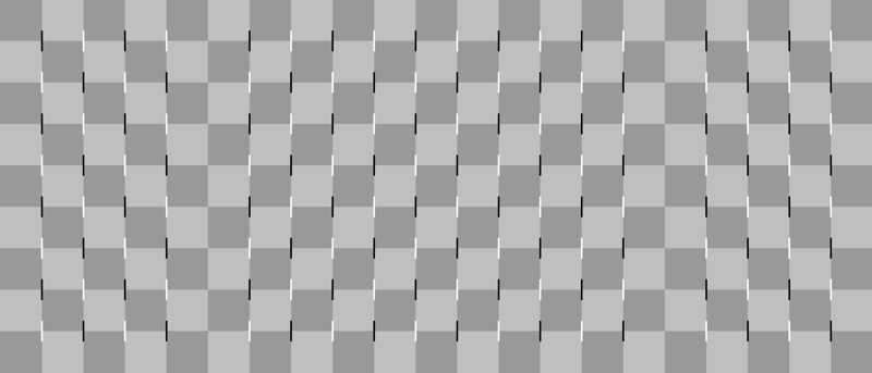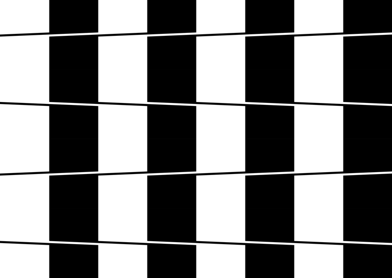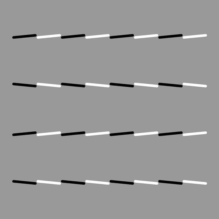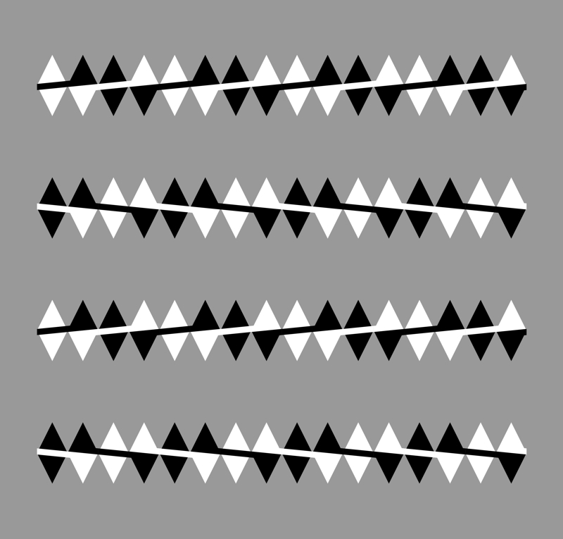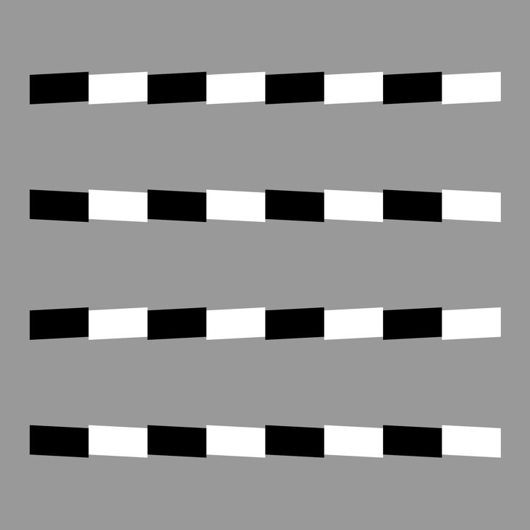 一番上の列の境界で言うと、左端から右に、上は黒で下は白のエッジ、白の線(上下は黒)、上は白で下は黒のエッジ、黒の線(上下は白)の順に並んでいて、それらが右端まで繰り返されている。すなわち、これらのエッジと線の列は水平に並んでいるのであるが、水平から反時計回りに(左に)傾いて見える。上から2番目の列ではそれは時計回りに傾いて見え、上から3番目は反時計回り、一番下の列では時計回りに傾いて見える。