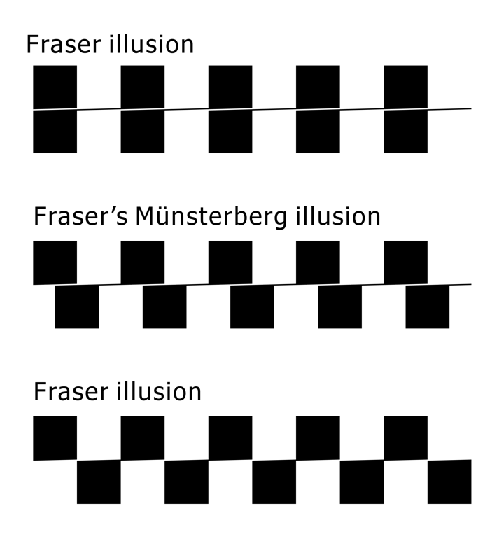 フレーザー錯視の構成要素は線である必要はなく、エッジでもよい。上から、水平に並んだ斜いたエッジの列は反時計回り、時計回り、反時計回り、時計回りに傾いて見える。