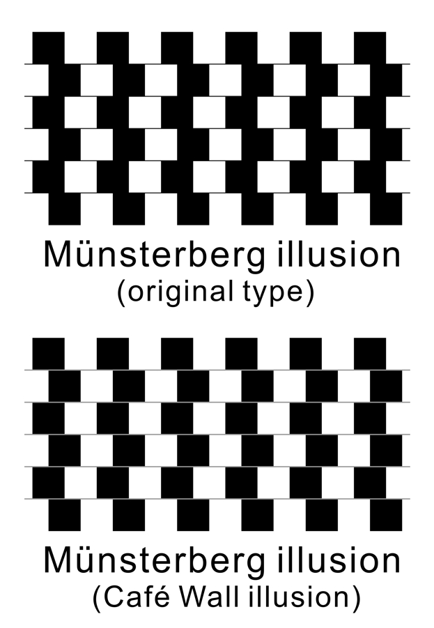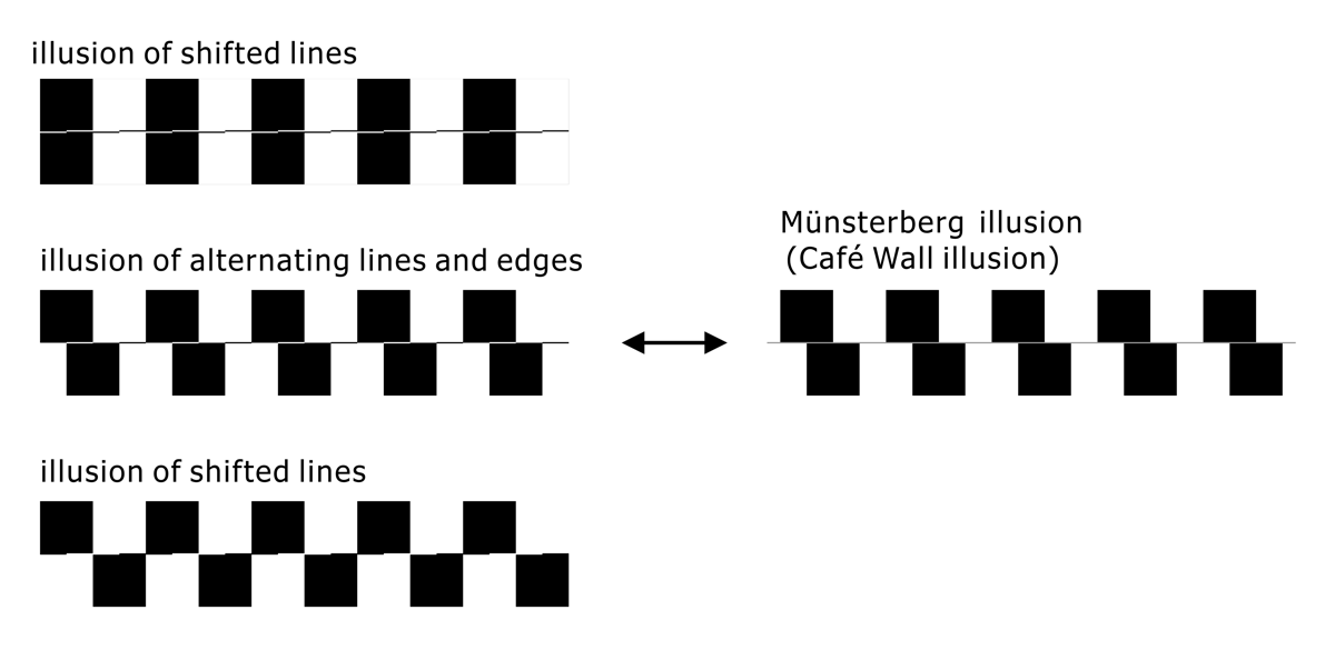 白と黒の正方形を交互に水平に配置した列を描き、列を垂直にコピーし、隣合う列は正方形の辺の半分だけずらして配置する。その場合、列の境界に細い線を引くと、それは水平であるが傾いて見える。黒い角この図では、上から反時計回り、時計回り、反時計回り、時計回り、反時計回りに傾いて見える。この錯視は本来はミュンスターベルク錯視と呼ぶべきであるが、細い線が灰色の時はそれが黒の時よりも錯視量が多く、カフェウォール錯視と呼ばれる。