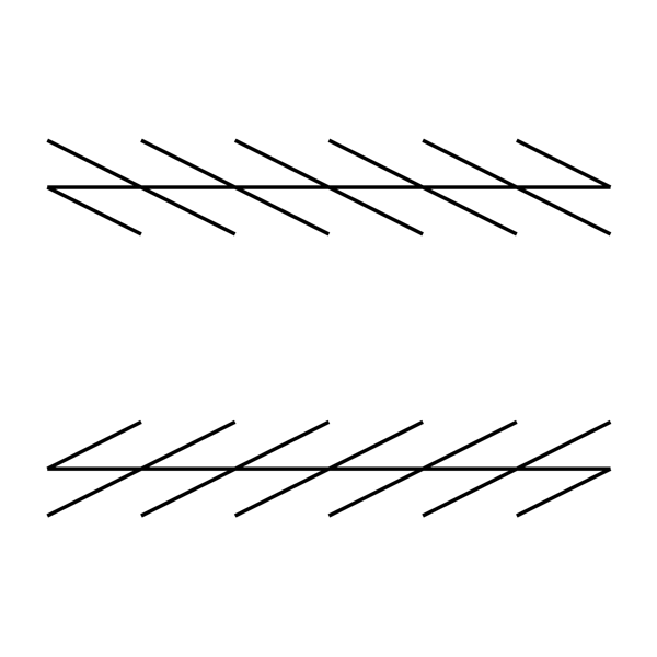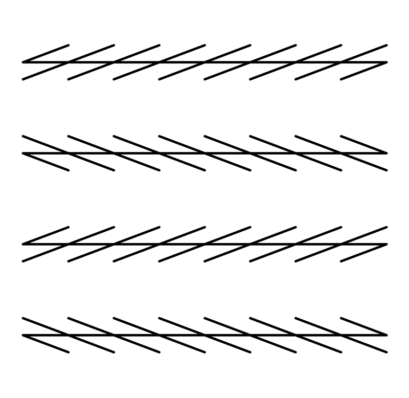 フレーザー錯視の構成要素としては、線とエッジを組み合わせてもよい。上から、水平に並んだ斜線と傾いたエッジの列は、反時計回り、時計回り、反時計回り、時計回りに傾いて見える。