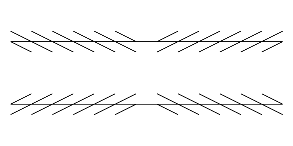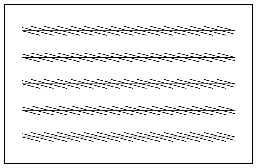 フレーザー錯視にはダイヤモンド状の縁飾りが必須というわけではないことがわかる。上から、水平に並んだ斜線の列は反時計回り、時計回り、反時計回り、時計回りに傾いて見える。