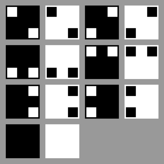 このように組み合わせると右上がりに見える(水平列が反時計回りに傾いて見える)。