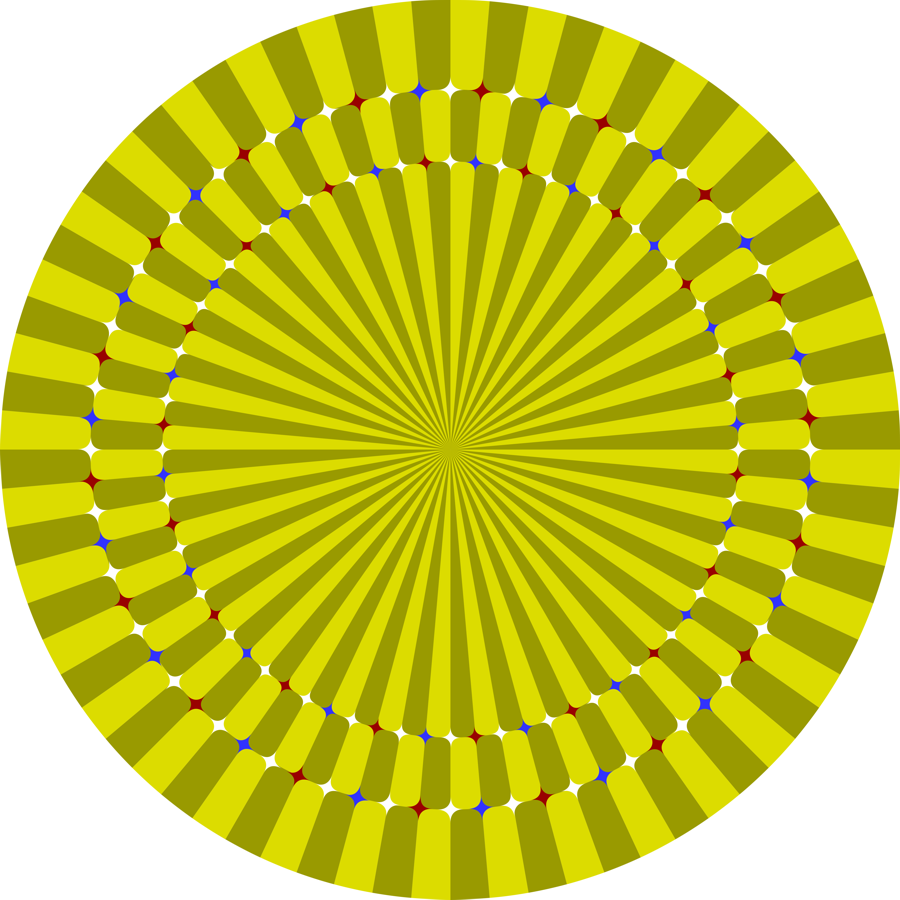 内側の領域では、垂直に配列した縞模様の線列は時計回りに(右に)傾いて見え、左右の領域では反時計回りに(左に)傾いて見える。印刷した図やスマホを上下に動かすとか、めがねを上下させるなどして網膜像が垂直方向になめらかにスリップさせると、中央の領域は左右に動いて見える。