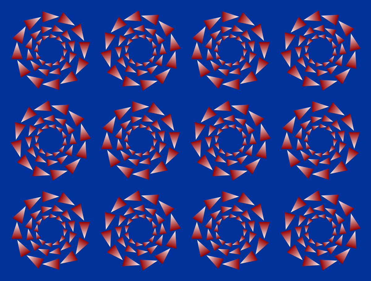 リングは回転して見える。明るい条件では、内側のリングは時計回り、外側のリングは反時計回りに回転して見える。逆に、暗い条件(印刷して暗いところで見る、あるいはNDフィルターを通して見る)では、内側のリングは反時計回り、外側のリングは時計回りに回転して見える。それらの拮抗する錯視の強さが釣り合っている時、小刻みにガクガクと回転方向が切り替わって見える。
